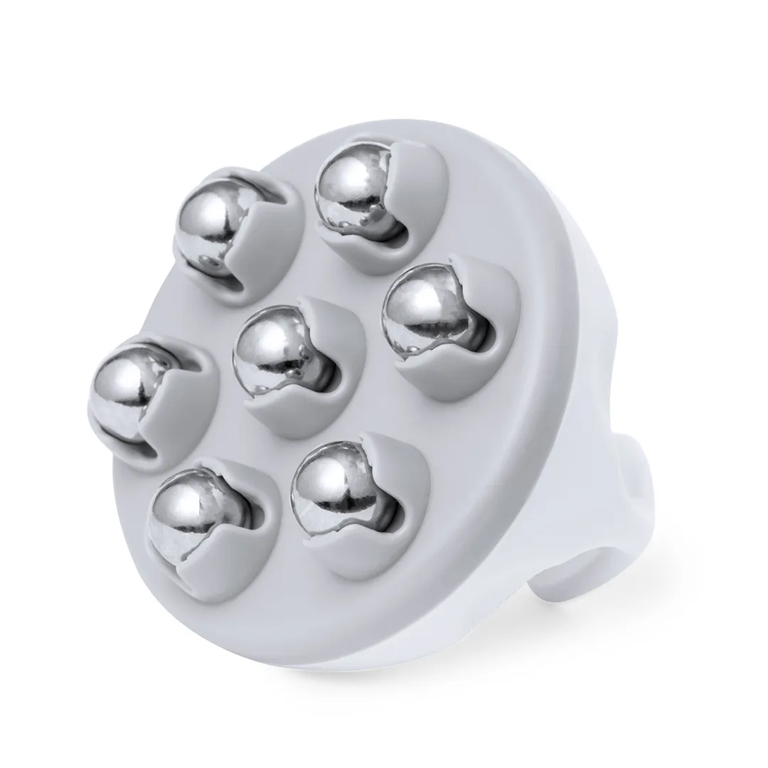Descripción: Masajeador fabricado en resistente ABS con bolas metálicas. Diseñado para brindar alivio y bienestar. Su empuñadura ergonómica garantiza un manejo cómodo, mientras que sus esferas metálicas efecto frío ayudan a la absorción de cremas, relajando la piel cansada. Presentado en caja individual de diseño kraft.
